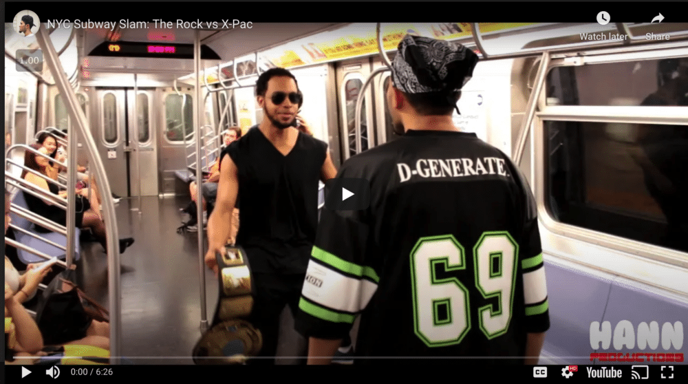 Subway car wrestling mania is just one more idea Tim Hann Rivera thought up and made happen. Image from Rivera's YouTube channel.
